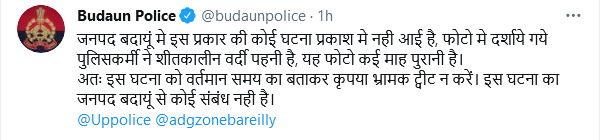 सोशल मीडिया में वायरल यह तस्वीर बदायूं की नहीं हैं। बदायूं पुलिस ने इस पर स्पष्टीकरण जारी करते हुए लिखा है कि जनपद मे इस प्रकार की कोई घटना प्रकाश मे नही आई है, फोटो मे दर्शाये गये पुलिसकर्मी ने शीतकालीन वर्दी पहनी है, यह फोटो कई माह पुरानी है। अतः इस घटना को वर्तमान समय का बताकर कृपया भ्रामक ट्वीट न करें। इस घटना का जनपद बदायूं से कोई संबंध नही है।