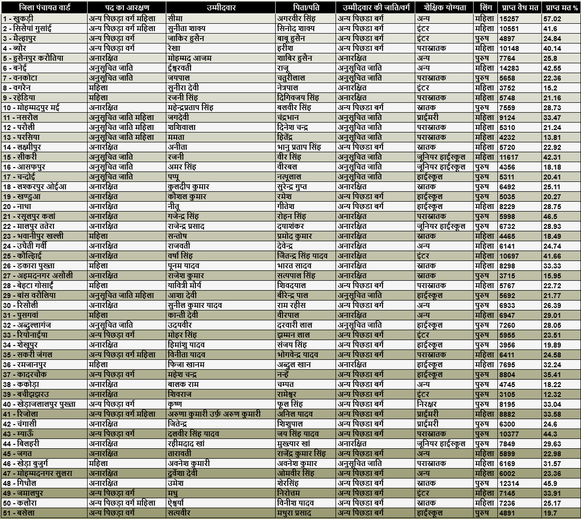 बदायूं। गांव की सरकार के लिए चुनाव परिणाम जानने को लोगों में भारी उत्सुकता थी। आखिर दो दिन की मतगणना के बाद त्रिस्तरीय पंचायत चुनाव के नतीजे आ चुके हैं। जिले में जिला पंचायत सदस्यों के 51 पद हैं, इसकी सूची भी जारी हो गयी है।