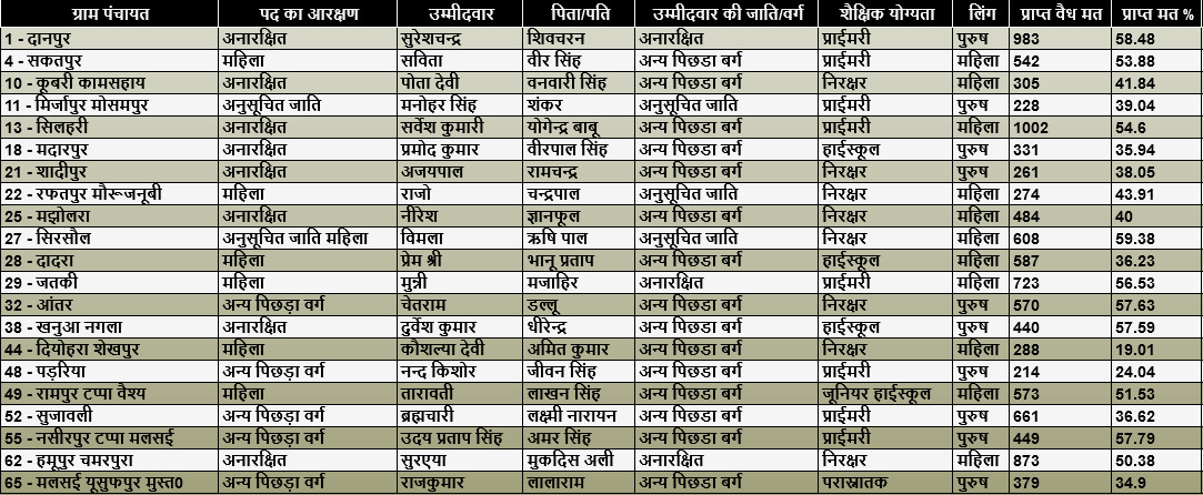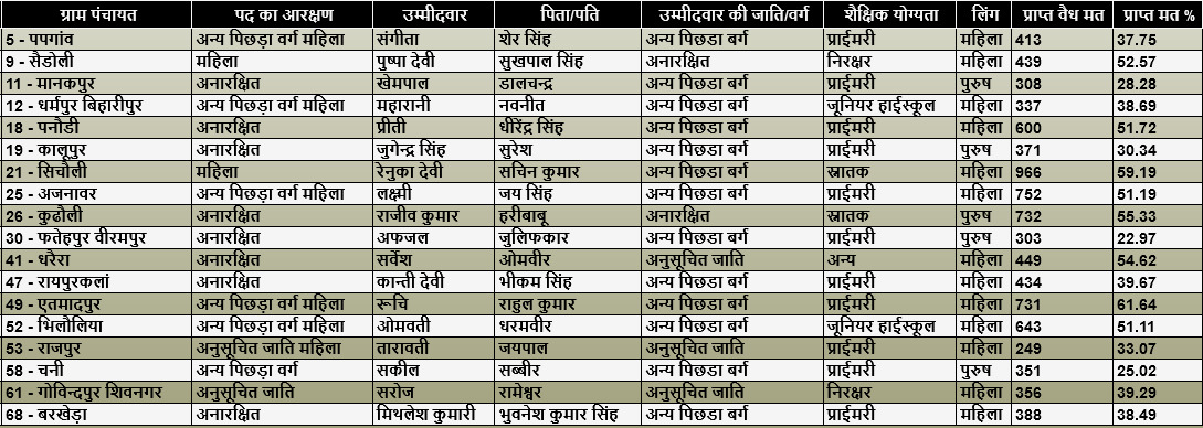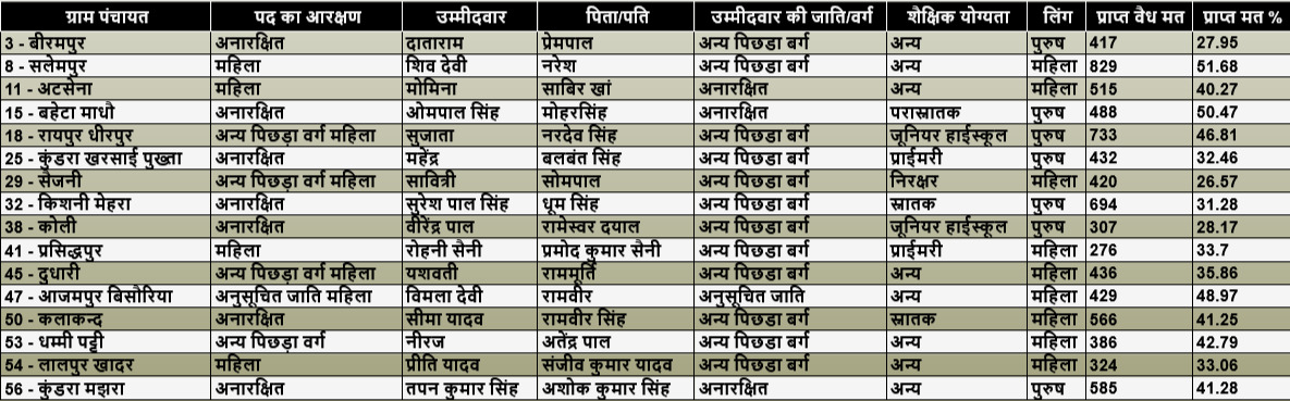 यहाँ की रसूलपुर विलहरी-1 ग्राम पंचायत से रामवेटी को जीत मिली हैं, उन्हें कुल 234 वोट मिले। ग्राम पंचायत मानपुर कुलचौरा- से राजेश कुमारी ने जीत हासिल की है, उन्हें 411 वोट मिले। ग्राम पंचायत मई बूचन-4 से सरफुनिशां मंसूरी ने जीती हैं, उन्हें 222 वोट मिले हैं। ग्राम पंचायत उघैनी-5 से शमशाद जीते हैं, उन्हें 402 वोट मिले हैं।