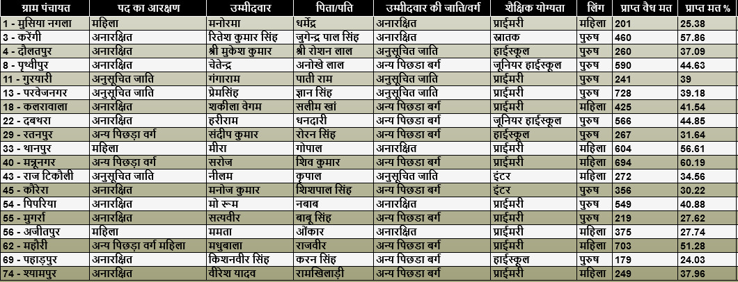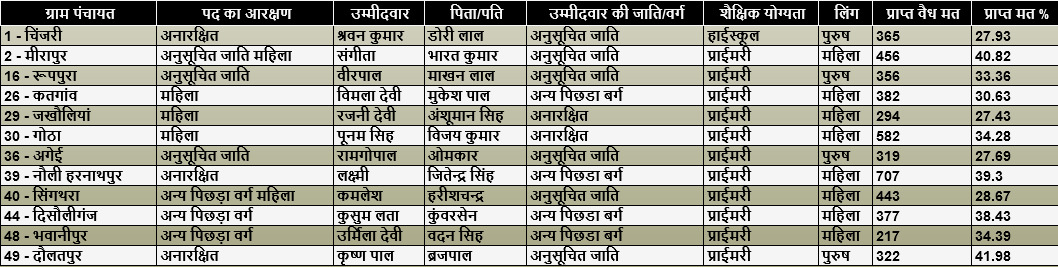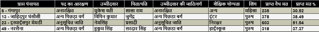 ग्राम पंचायत भवानीपुर-48 में उर्मिला देवी को जीत मिली है। उन्हें 217 वोट मिले हैं। ग्राम पंचायत दौलतपुर-49 से कृष्ण पाल जीते हैं, उन्हें 322 वोट मिले हैं।