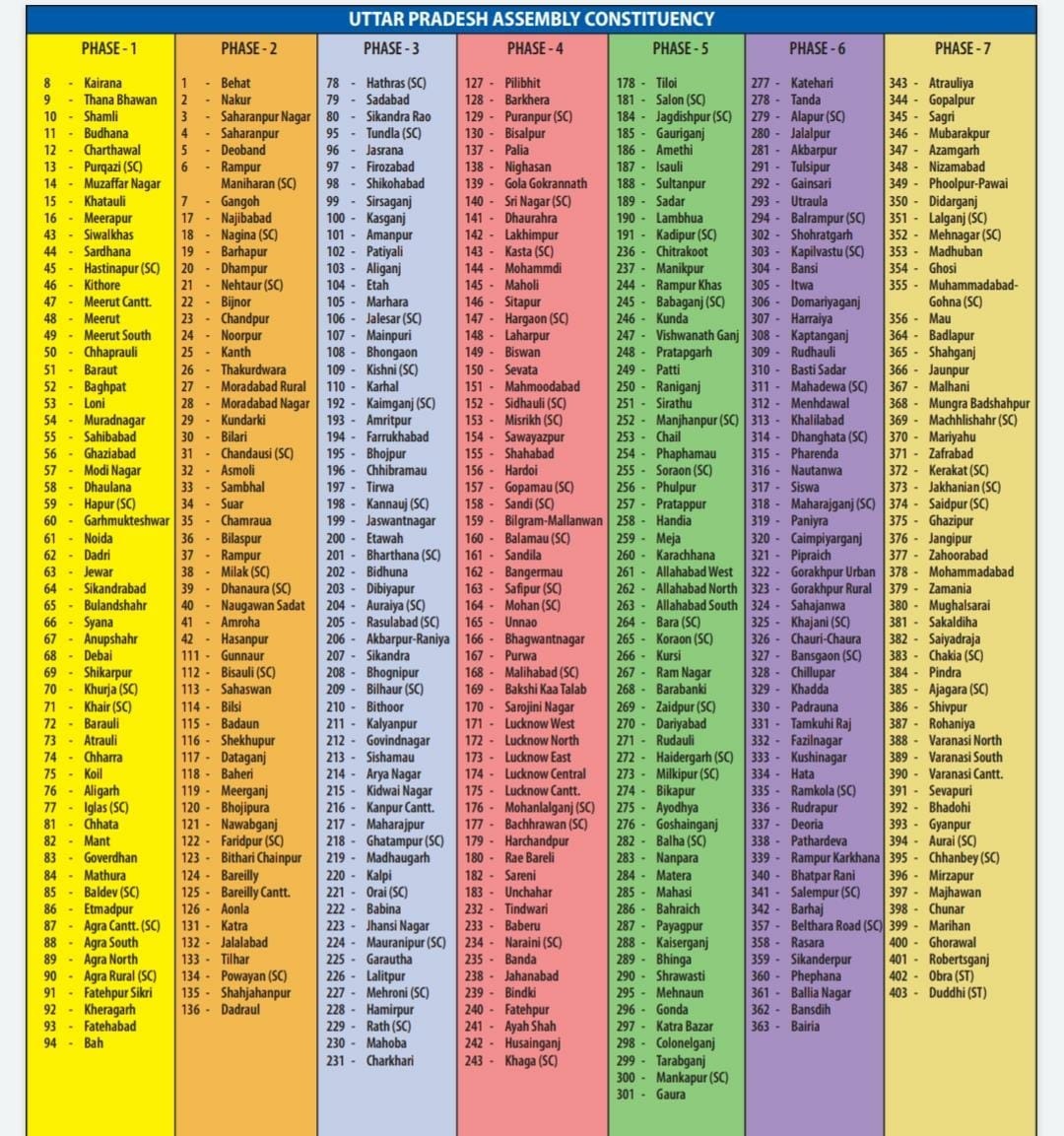 मुख्य चुनाव आयुक्त सुशील चन्द्रा ने बताया कि उत्तर प्रदेश में 7 चरणों में चुनाव होंगे। यूपी में इन चरणों के तहत 10 फरवरी, 14 फरवरी, 22 फरवरी, 23 फरवरी, 27 फरवरी, 3 मार्च और 7 मार्च को मतदान होगा। 10 मार्च को चुनाव के नतीजे आएंगे। पहले चरण की शुरुआत पश्चिम उत्तर प्रदेश के जिलों से होगी और धीरे-धीरे कारवां बढ़ते हुए पूर्वी उत्तर प्रदेश पर जाकर समाप्त होगा। यूपी में इस बार भी चुनाव पिछली बार की तरह वेस्ट यूपी से शुरू होंगे। आखिरी चरण पूर्वांचल में होगा। पहले चरण में 58 और आखिरी चरण में 64 विधानसभाओं में चुनाव होगा।